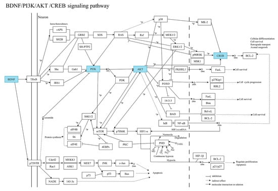Analysis of the KEGG pathway for all differentially expressed proteins revealed significant changes in the PI3K-Akt signaling pathway. In the detailed map of this pathway (Figure 6), BDNF was found to be the most highly associated protein with this pathway. Among the differential proteins identified in this study, BDNF, CREB, PI3K, and Akt are the most important proteins involved in this pathway, detailed in Figure 7.