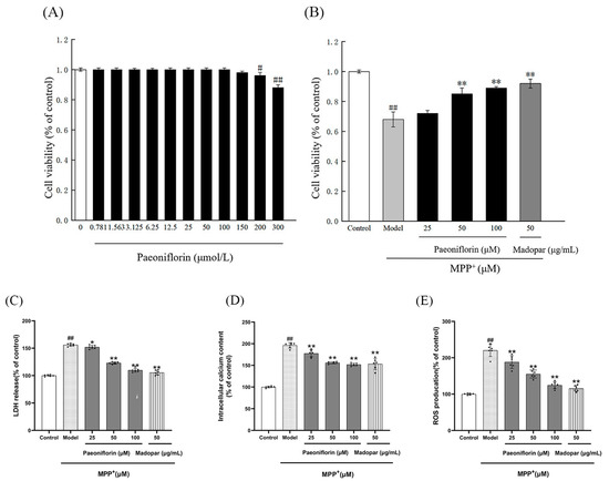 Culture conditions for PC12 cells involved DMEM enriched with a 10% concentration of fetal bovine serum along with antibiotics, specifically 100 units/mL each of penicillin and streptomycin. To promote ideal proliferation, the environment for incubation was regulated to maintain a temperature of 37 °C and an atmospheric composition of 5% CO2 with the remainder being air. For the experimental assays, only cells that were actively proliferating in their logarithmic growth phase were selected to ensure consistency in responses. The study involved treating the PC12 cells with a range of PF concentrations (0 to 300 μM) for 24 h to meticulously assess the cytotoxic potential of PF via the MTT assay. To develop an in vitro Parkinson’s disease model, cells underwent exposure to 500 μM of MPP+ over 24 h. Initially, to prepare for MPP+ exposure (500 μM), cells received treatments with varying doses of PF (25, 50, and 100 μM) or Madopar (50 μg/mL) as a reference control, 48 h in advance. This preliminary treatment aimed to assess the protective capacity of PF and Madopar against the induction of Parkinson’s disease-like effects in PC12 cells, thereby laying the groundwork for further in-depth experimental analysis.