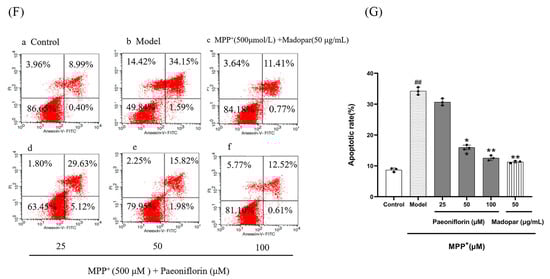 As shown in Figure 8G, the apoptosis rate of PC12 cells in each group was detected by flow cytometry. The experimental data showed that the apoptosis rate in the normal control group was 9.31%, while the apoptosis rate in the MPP+-induced Model group was significantly elevated to 35.74% (p < 0.01). After pretreatment with paeoniflorin, the apoptosis rate decreased in a dose-dependent manner, with the apoptosis rate of 28.38% in the 12.5 μmol/L group (* p < 0.05), decreasing to 18.18% in the 25 μmol/L group (p < 0.01), and further decreasing to 12.56% in the 50 μmol/L group (p < 0.01).