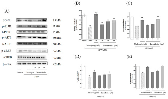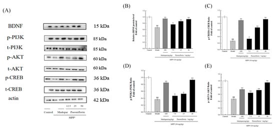 As depicted in Figure 13, the expression levels of BDNF, phosphorylated PI3K (p-PI3K), phosphorylated AKT (p-AKT), and phosphorylated CREB (p-CREB) in the brain tissues of mice from the Model group were significantly lower compared to the control group. Additionally, the ratios of BDNF to β-actin, p-PI3K to total PI3K (t-PI3K), p-AKT to total AKT (t-AKT), and p-CREB to total CREB (t-CREB) were notably decreased (p < 0.01). In contrast, in the group treated with paeoniflorin, these ratios were significantly higher compared to the Model group, mirroring the positive control results obtained with Madopar.