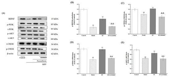 The PI3K/AKT pathway, a pivotal component of the effects resulting from the interaction between BDNF/TrkB, functions as the primary anti-apoptotic mechanism. This pathway plays a critical role in neuronal survival, synaptic plasticity, and the mimetic effects of antidepressants [42]. PI3K initiation represents a critical survival line to cells in order for them to escape apoptotic damage [43]. This action activates AKT phosphorylation upregulating defense against apoptosis and maintenance of brain function [44].AKT-mediated phosphorylation inactivates inhibitors of apoptosis, thereby promoting cell survival [45,46]. This result indicates that the PI3K/Akt pathway may be one of the main ways through which PF reduces the toxic influence of MPTP/MPP+ on neural cells. The next topic to research will be the BDNF/CREB and PI3K/AKT modulation effects of PF’s protection against Parkinson’s disease, and, in particular, the determination of the expression levels of proteins such as AKT, P-PI3K, and AKT2.