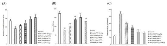 Mice subjected to MPTP treatment displayed a significant decrease in spontaneous motor activities (p < 0.01) and a considerable decline in performance on the rotarod test (p < 0.01), exhibiting significantly prolonged climbing times (p < 0.01), compared to the control group. In contrast, administration of PF at doses of 15 and 30 mg/kg effectively reversed these behavioral deficits, countering the detrimental effects of MPTP-induced toxicity (p < 0.01 for each comparison), as depicted in Figure 11.