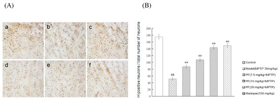 Representative microphotographs of TH immunostaining in the substantia nigra are shown in Figure 12. Animals that received vehicle-only treatment following MPTP injection exhibited a significant loss of TH-immunopositive neurons (p < 0.05). In contrast, treatment with PF at doses of 7.5, 15, and 30 mg/kg, as well as Madopar treatment, significantly inhibited neuronal loss and increased the number of TH-positive neurons compared to the MPTP group (p < 0.01).