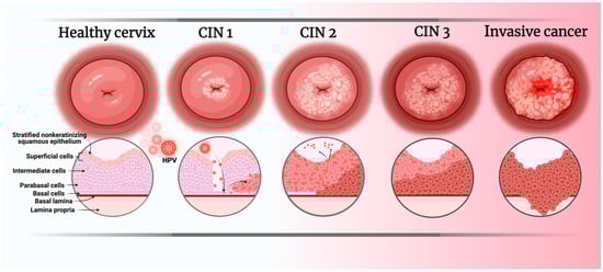 Stages of HPV infection development leading to the appearance of CC. CIN: Cervical intraepithelial neoplasm. Image created in BioRender.com/bszht4w (accessed on 17 June 2025).