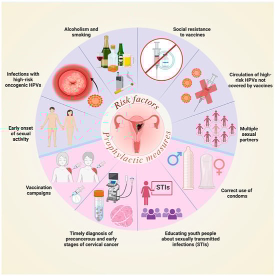 Currently, various prophylactic measures exist to prevent HPV infections, including vaccination campaigns against some high-risk oncogenic HPV types, correct condom use, and raising awareness among the youth population about sexually transmitted infections. However, several factors contribute to the persistently high morbidity and mortality rates of CC worldwide. These include early sexual activity, multiple sexual partners, lack of awareness among young people, alcohol consumption, smoking, resistance to vaccination, and the circulation of HPV strains not covered by the vaccine [1,2] (Figure 2).