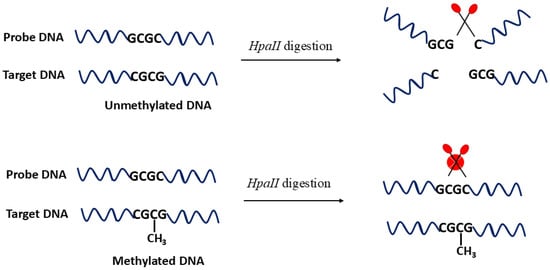 HpaII cleaves the C–G pair in unmethylated DNA (upper part of the figure) and such cleavage is blocked when the internal C is methylated (lower part of the figure). This detection specificity allows