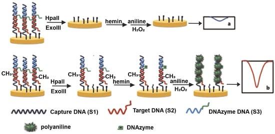 Exonuclease III (Exo III); hence, the G-rich DNA—responsible for catalyzing PANI polymerization—was removed, resulting in reduced current response. Conversely, in the presence of MTase, methylation inhibited