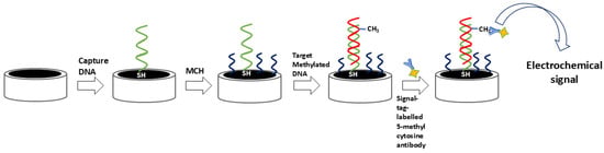 50]. In this case, hemi-methylated DNA probes were immobilized on a gold electrode, and methylation states were probed via ferrocene carboxylic acid tags at the 3′ end. In the absence of demethylase, methylated sites blocked