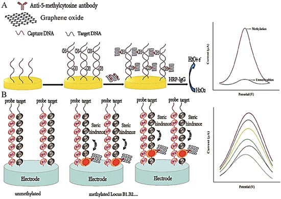 Figure 5. Similarly, Shiddiky et al. employed bioengineered polyhydroxybutyrate nanobeads functionalized with anti-5-mC-HRP conjugates to facilitate amperometric detection of methylated DNA in ovarian cancer cells [