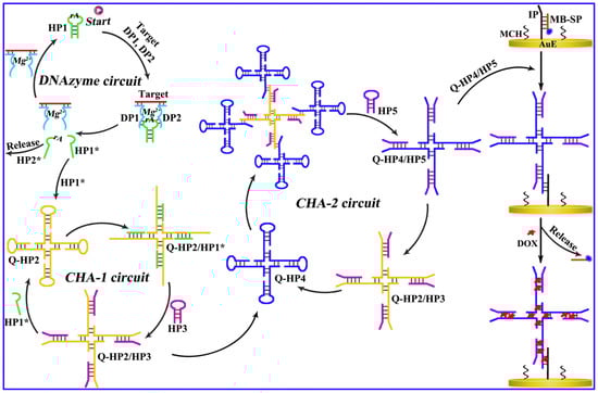 59]. This procedure involves an upstream DNAzyme and two downstream CHA units. The two segments of the DNAzyme were inserted by the two probe units called DP1 and DP2, which are hybridized with the target methylated DNA. This interaction activated a Mg