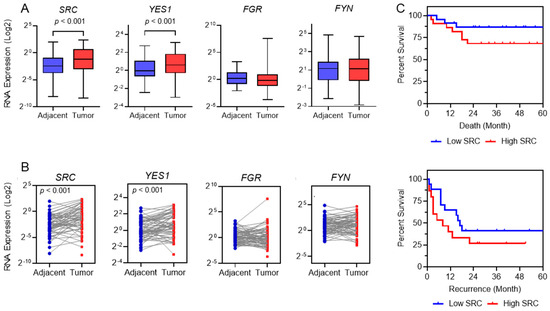 To investigate SFKs’ potential role in HCC development, we analyzed the gene expression levels of four SFK members—SRC/ASV1, FGR, YES1, and FYN—in human clinical specimens using reverse transcription-quantitative real time polymerase chain reaction (RT-qPCR). Paired tissue samples, consisting of tumor (HCC nodule) and adjacent non-tumoral liver tissues, were obtained from 61 HCC patients (mean age: 54 years; 48 males, 13 females). As shown in Figure 1A,B, SRC expression was significantly upregulated in tumor tissues compared to matched non-tumorous tissues (paired Student’s t-test, p < 0.001). A similar trend was observed for YES1 (p < 0.001), whereas FGR and FYN did not show significant differences.
