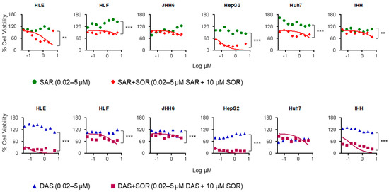 Cytotoxicity assay results of two Src family kinase inhibitors, saracatinib and dasatinib, alone and in combination with 10 µM sorafenib in different hepatic cell lines. All cells were treated with either saracatinib or dasatinib with a concentration ranging from 0.02 to 5.0 µM for 24 h. Two-tailed paired Student’s t-test, ** p < 0.01, *** p < 0.001. DAS: dasatinib; SAR: saracatinib, SOR: sorafenib.