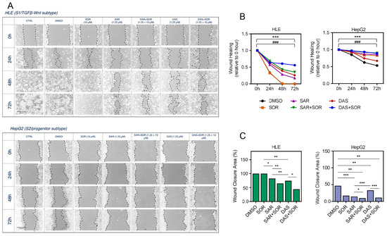 HLE and HepG2 cells, representing S1 and S2 HCC subtypes, respectively, were grown in a 12-well plate with an initial concentration of 37,500 cells/cm2. After 24 h, a longitudinal scratch was introduced to the monolayer of cells in each well using the end of a white pipette tip, and the medium was replaced with new medium containing treatment set-ups. The concentration of drugs used were 10 μM of sorafenib, 1.25 μM of saracatinib, 1.25 μM of dasatinib, and their combinations. The migration capacity of the cells was recorded by taking representative photos of each treatment set-up in 6 different wound spots using an optical microscope (Leica, Solms, Hesse, Germany). The quantification was performed by measuring the wound area using ImageJ 1.54g (National Institutes of Health, Bethesda, MD, USA). Data were obtained at 0, 24, 48, and 72 h. Data were generated as the area of the percentage (%) of wound closure computed as follows: ((t0−th)/t0)) × 100%, where t0 is the area of the wound measured immediately after scratching, and th is the area of the wound measured “h” hours after the scratch is performed. Results are presented as means of the measurements of areas and standard deviation between the representative points.