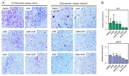 Transwell cell migration assay. (A) Representative light microscope images of HLE (S1/TGFβ-Wnt subtype) and HepG2 (S2/progenitor subtype) after treatment with saracatinib and dasatinib alone or in combination with sorafenib. Original objective magnification = 10×. (B) Relative absorbance of HLE and HepG2 after treatment. Data are presented as mean ± SEM from at least three independent replicates. DAS: dasatinib-treated cells, DMSO: DMSO-treated control cells, SAR: saracatinib-treated cells, SOR: sorafenib-treated cells.