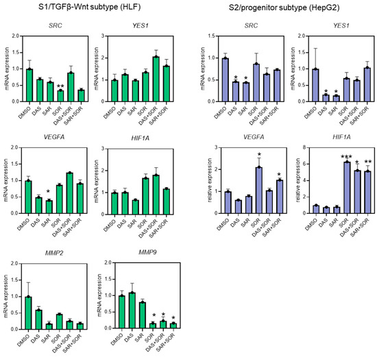 Relative gene expression of SRC, YES1, VEGFA, HIF1A, MMP2, and MMP9 in the human HCC cell lines HLF (S1/TGFβ-Wnt subtype) and HepG2 (S2/progenitor subtype). DMSO control cells were set at 1.0. * p < 0.05, ** p < 0.01, and *** p < 0.001 vs. DMSO. All gene expression data were normalized to reference genes GAPDH and 18S-rRNA. Data are presented as mean ± SEM from three independent replicates. DAS: dasatinib-treated cells, DMSO: DMSO-treated control cells, SAR: saracatinib-treated cells, SOR: sorafenib-treated cells.