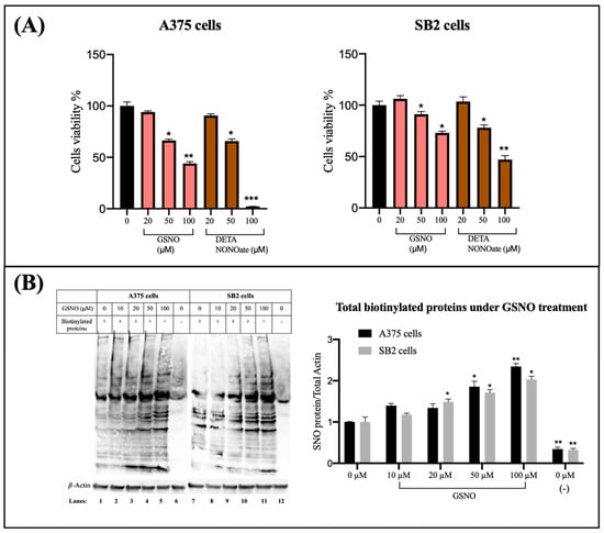 This trend was quantitatively supported by densitometric analysis normalized to β-actin (Figure 1B, right panel). Treatment with 10 µM GSNO induced a modest increase in S-nitrosylated proteins (approximately 20–40%) in both A375 and SB2 cells. At 100 µM GSNO, the total S-nitrosylated protein levels increased more than two-fold relative to untreated controls, reaching statistical significance (p < 0.05 and p < 0.01), indicating a robust nitrosative response.