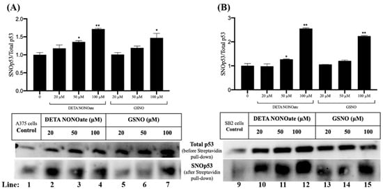 Treatment with both GSNO and DETA NONOate led to a dose-dependent increase in the relative level of SNO-p53 compared to total p53 (Figure 2). In A375 cells (Figure 2A), 100 µM DETA NONOate induced the highest level of SNO-p53, with an approximate 80% increase relative to control (lane 4; p < 0.01), while 100 µM GSNO resulted in a 60% increase (lane 7; p < 0.05). Similarly, in SB2 cells (Figure 2B), a pronounced elevation in SNO-p53 was observed with 100 µM of both DETA NONOate and GSNO, with increases of approximately 150% and 130%, respectively (lanes 12 and 15; p < 0.01).