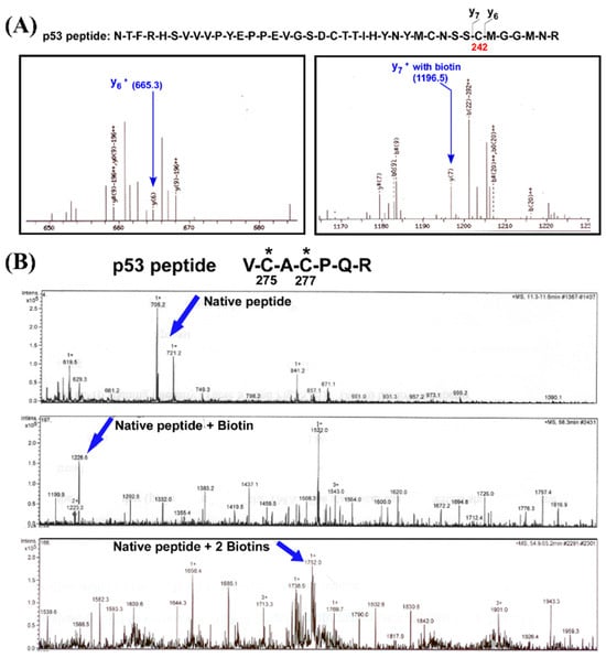 As shown in Figure 3A, tandem MS spectra identified a tryptic peptide of p53 (residues 221–242: N-T-F-R-H-S-V-V-V-P-Y-E-P-P-E-V-G-S-D-C-T-T-I-H-Y-N-Y-M-C-S-C-M-G-G-M-N-R) containing Cys242, modified with a biotin adduct indicative of prior SNO. The mass shift corresponding to the y7 ion (1196.5 m/z) confirmed the presence of biotin on this residue. Additionally, in Figure 3B, another p53-derived peptide (residues 275–280: V-C-A-C-P-Q-R) exhibited mono- and di-biotinylated species, revealing two additional sites of SNO at Cys275 and Cys277, respectively. The progressive mass shifts and fragmentation patterns aligned with the expected modifications resulting from maleimide-PEO2-biotin derivatization during the biotin switch assay, affirming the specificity of the detection.