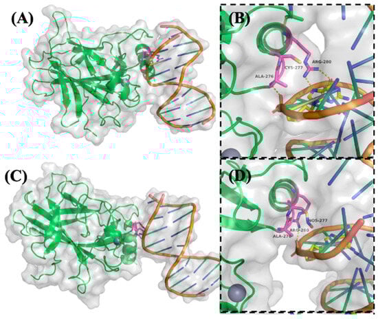 As shown in Figure 4A,B, native p53 engages DNA via a well-structured interaction interface. Arg280 forms two critical hydrogen bonds with a conserved guanine base in the DNA major groove, serving as a key anchoring residue. Ala276 stabilizes the complex through a hydrogen bond with the DNA phosphate backbone, while Cys277 lies in close proximity, potentially influencing local structural conformation [26].