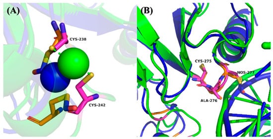 In addition to DNA binding, p53 activity is critically dependent on zinc ion (Zn2+) coordination, which stabilizes the DNA-binding domain. Cys238 and Cys242 directly participate in Zn2+ chelation and are essential for maintaining the correct protein fold [27,28]. As illustrated in Figure 5A, SNO of Cys242 induces a noticeable displacement of this residue away from the Zn2+ ion, diminishing its chelation capacity and suggesting partial destabilization of the p53 structural core. This conformational shift could reduce the overall stability of the DNA-binding domain, thereby compromising p53’s functional integrity under nitrosative stress conditions.