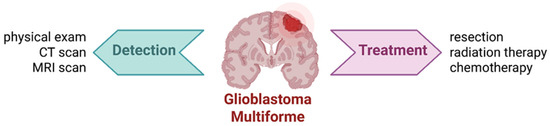 Magnetic resonance imaging (MRI) remains the diagnostic tool of choice, and in many cases, tumors are identified when they reach a diameter of approximately 4 cm. The standard of care for newly diagnosed neuroblastoma includes tumor resection, radiation therapy, and chemotherapy (Figure 2) [12]. However, poor GBM prognosis is largely due to the tumor’s highly proliferative and infiltrative nature, which prevents complete surgical resection [13]. Radiotherapy is often ineffective, hindered by the BBB and the presence of therapy-resistant cells in hypoxic tumor regions [14]. The standard treatment includes maximal surgical resection followed by radiotherapy and chemotherapy, which together may extend survival up to 202 weeks [15]. Temozolomide, administered alone or in conjunction with radiotherapy, has shown to prolong survival with minimal additional toxicity [16]. Adjuvant therapies include corticosteroids for vasogenic edema and antiepileptic drugs for seizure management [11].