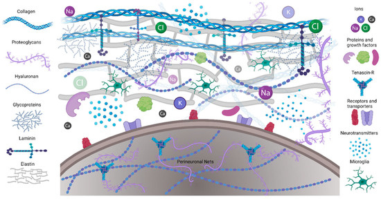 - Novak, U.; Kaye, A.H. Extracellular Matrix and the Brain: Components and Function. J. Clin. Neurosci. 2000, 7, 280–290. [Google Scholar] [CrossRef]