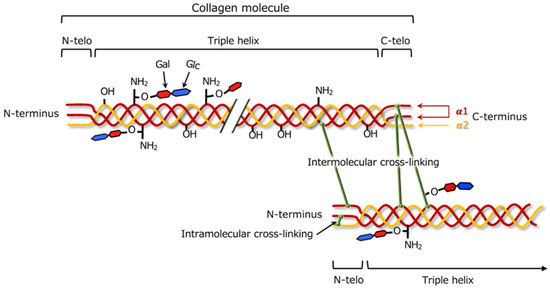 Illustration of type I collagen cross-links formed between two adjacent molecules. Reprinted with permission from [38]. Copyright (2023) Wiley.