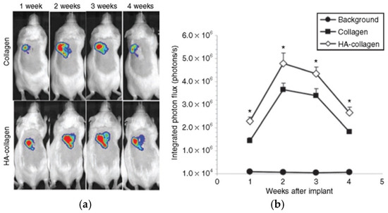 In vivo cell transduction by lentivirus in collagen gels. (a) Imaging and quantification of firefly luciferase expression for 4 weeks following subcutaneous implantation of lentivirus or hydroxylapatite (HA)/lentivirus-loaded collagen gels. Lentivirus encoding luciferase (Lenti-luc, 3 × 108 lentivirus particles) was loaded during gelation. (b) Integrated light flux (photons/second) as measured using constant-size regions of interest over the implant site (n = 4 for experimental and background data). Collagen gels loaded with lentivirus encoding luciferase (closed squares), HA/lentivirus (open diamonds), and background (closed circles). Values are mean ± SEM. * Statistical significance relative to control group at p < 0.05. Reprinted with permission from [60], Copyright (2010) Cell Press.