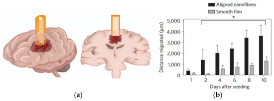 Schematic and image of conduit inserted into a rat brain. (a) Representation of the tumor guide containing a nanofiber film inserted into a rat brain. Three-dimensional view (left) and coronal view (right) of the brain and conduit. (b) The graph demonstrates that the distance the tumor cells migrated over ten days was statistically significant on the aligned nanofibers compared with the distance migrated on the smooth film. Mean and standard deviation are shown. Statistical difference was determined using Tukey’s test. A value of * p < 0.05 was considered to be statistically significant. Reprinted with permission from [61]. Copyright (2014) Springer Nature.