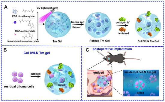 Synthesis of Col IV/LN Tm gel and its effect on inhibiting glioma recurrence. (A) PEG dimethacrylate, N-succinimide methacrylate, and TMZ methacrylate formed Tm gel under ultraviolet (UV) light. The Tm gel was repeatedly frozen and thawed for holes. Then, collagen IV and laminin-1 were incubated with Tm gel to form Col IV/LN Tm gel. (B) The collagen IV/laminin-1 layer of Col IV/LN Tm gel enticed residual glioma cells to migrate into holes, and then the inner TMZ released to kill recruited glioma cells for inhibiting the recurrence of glioma after surgery. (C) Anti-tumor effects of Col IV/LN Tm gel. Residual glioma cells were drawn into the holes by the presence of collagen IV and laminin-1 and subsequently eliminated when the contained TMZ inside the hydrogel was released. Reprinted with permission from [5]. Copyright (2025) Elsevier.