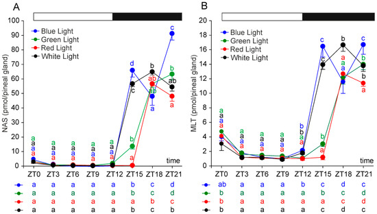 The daily patterns of MLT levels closely resembled those observed for NAS across all experimental groups, although the amplitude of changes was generally much lower (Figure 1B). During scotophase, MLT contents did not exceed photophase levels by more than 20-fold. The nocturnal increase in MLT levels was more pronounced in the control group and the blue-light group compared with the green- and red-light groups. Similar to NAS, the duration of elevated MLT levels was longer in the control and blue-light groups than in the green- and red-light groups. Peak MLT contents occurred at ZT 18 in the control and red-light groups and at ZT 21 in the green-light group. In the blue-light group, two distinct nocturnal peaks were observed—at ZT 15 and ZT 21.
