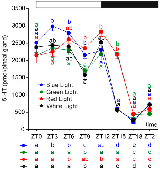 Contents (mean and SEM) of serotonin in the pineal glands of rats kept under monochromatic blue, green, and red light or fluorescent white light. The horizontal bar demonstrates the periods of light and dark phases of the daily cycle. The letters on the charts show statistically significant differences between groups at each time point. The letters below the charts show statistically significant differences between time points within a group. The same letters indicate means, which are not significantly different.