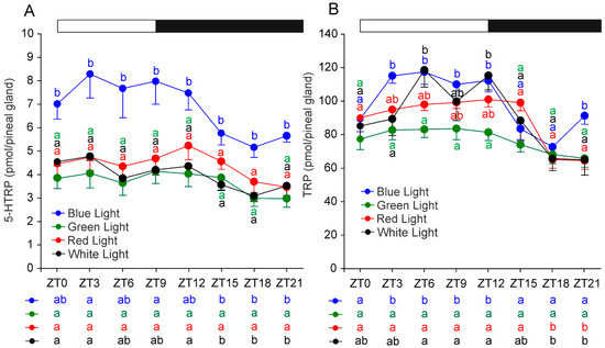 Contents (mean and SEM) of 5-hydroxytryptophan (A) and tryptophan (B) in the pineal glands of rats kept under monochromatic blue, green, and red light or fluorescent white light. The horizontal bar demonstrates the periods of light and dark phases of the daily cycle. The letters on the charts show statistically significant differences between groups at each time point. The letters below the charts show statistically significant differences between time points within a group. The same letters indicate means, which are not significantly different.