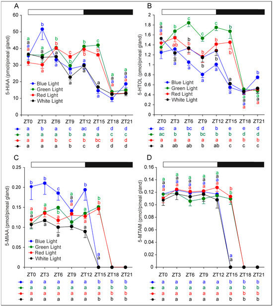 Similarly to 5-MIAA, 5-methoxytryptamine (5-MTAM) was not detected at ZT 15, ZT 18, and ZT 21 in the control and blue-light groups, and at ZT 18 and ZT 21 in the red- and green-light groups (Figure 4D). Photophase levels of 5-MTAM were also consistently very low across all group.