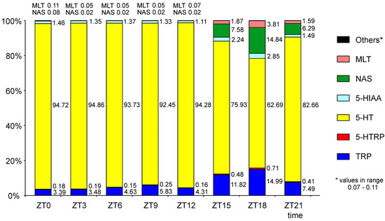 Percentage composition of indolic compounds in rat pineal glands collected at 3-h intervals over a 24 h cycle.