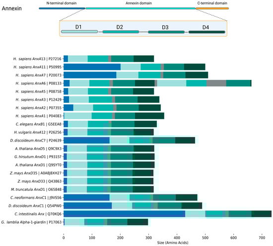 A graphical representation of a generic annexin structure with four signature domains (D1–D4), focusing on the diversity of N-terminal head domains. The figure highlights the annexins discussed in this review. Sequence information and predicted domain organization were extracted from UniProt.