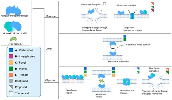 There is limited information available on annexins from different kingdoms. In the context of the fungus Cryptococcus neoformans, no alterations resulting from the deletion of AnxC1 could be observed [37]. Conversely, in Dictyostelium, the response to membrane damage was found to be slower following the deletion of annexins AnxC1 and AnxC2 [38].