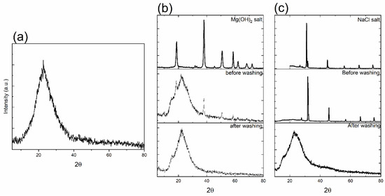 The X-ray diffraction spectra of as-synthesized MBG where (a) shows the spectra for MBG-C; (b) shows the spectra for Mg(OH)2 salt, MBG-M before washing, and MBG after washing; and (c) shows the spectra of NaCl salt, MBG-N before washing, and MBG after washing.