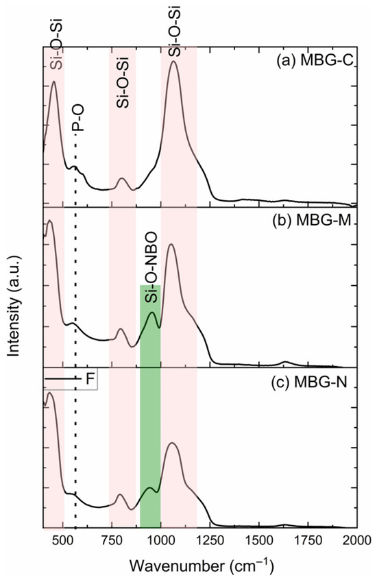 The FTIR spectra of (a) MBG-C, (b) MBG-M, and (c) MBG-N. The spectra show the silicon bonded to bridging oxygens (Si-O-Si) and silicon bonded to non-bridging (Si-O-NBO) as well as the P-O bonds as observed in the synthesized glass.