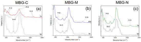 The structure and bioactivity of different MBGs were investigated using a Cary 630 spectrometer (Agilent, Santa Clara, CA, USA) to assess molecular vibrations using the KBr pellet method from 4500 to 400 cm−1, before and after immersion in SBF. The MBG samples were immersed in SBF to evaluate the growth of HA nanocrystals on the material surface as a measure of bioactivity. Each glass sample was filtered and dried at predetermined times and then analyzed using FTIR following protocols established in previous studies [1,61].