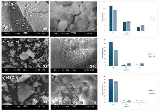 SEM analysis shows the bioactivity progression of various samples at different times following immersion in SBF. This technique is widely used to assess the bone-bonding potential of biomaterials [34]. Figure 5 shows the different MBG samples before and after immersion in SBF. Figure 5a shows the development of HA on the calcined sample’s surface after a week in SBF. Initially, the particles appear solid without visible degradation. However, the subsequent image shows evidence of HA formation, a crucial indicator of bioactivity [20]. This observation is corroborated by EDX data, which reports atomic percentages of Si, Ca, and P as 19.1, 8.6, and 4.9, respectively, after 7 days in SBF, yielding a Ca/P ratio of 1.76. This ratio approaches that of stoichiometric HA (1.67), suggesting the formation of a calcium phosphate layer [35]. In comparison, pre-immersion data showed atomic percentages of 22.5, 7.8, and 3.7 for Si, Ca, and P, respectively.