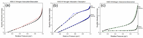 Nitrogen adsorption–desorption of (a) MBG-C, (b) MBG-M before and after washing, and (c) MBG-N before and after washing.