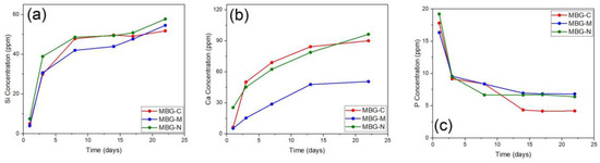ICP-OES results showing the release of (a) silicon, (b) calcium, and (c) phosphorus ions from MBG-C, MBG-M, and MBG-N over a period of 22 days. The ion release shows the biomineralization process of MBG through the release of ions and the formation of calcium phosphate groups on the surface of bioactive glass.