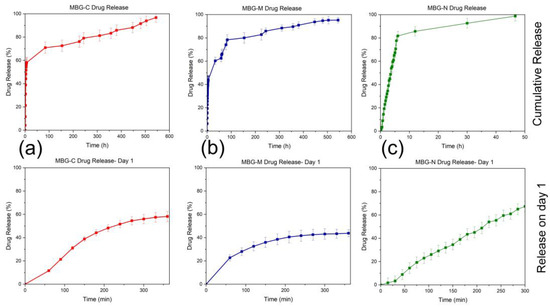 Figure 8c shows the release of MBG-N; this formulation had the lowest loading out of all of them and released all loaded drugs within 50 h of the start of the experiments. As with all the other formulations, there was a burst release initially followed by a slower release that lasted only a couple of days where it achieved 100% release. This formulation had the lowest loading rate, which means there was less drug initially, and it was probably adsorbed to the surface of the MBG, releasing as it was immersed in PBS. About 80% of the drug was released within the first 10 h, followed by a plateau that led to a slight increase in release over the next 40 h.