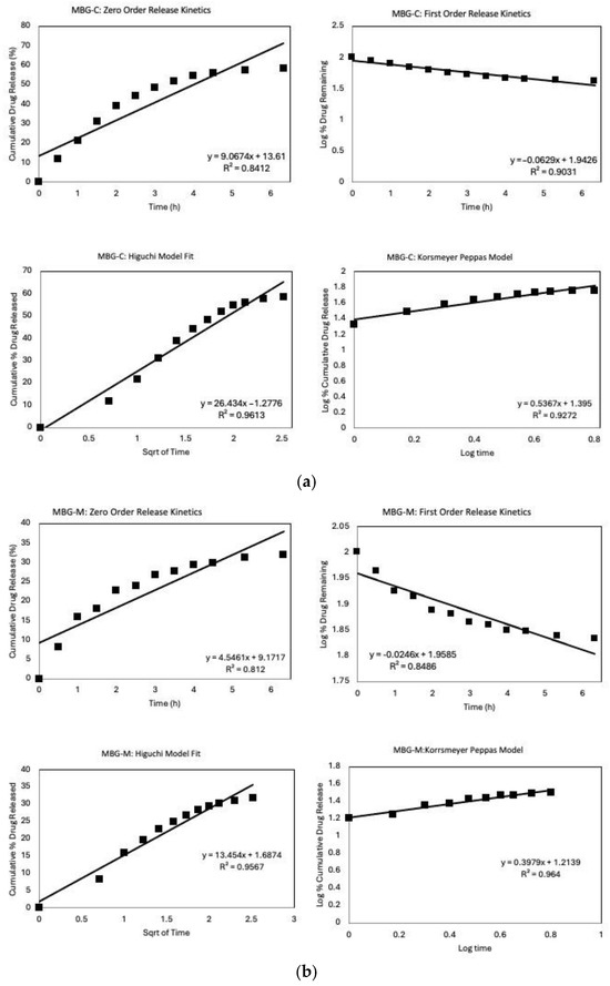 Figure 8a shows the release profile of MBG-C, which initially has a burst release of the drug in the first six hours of the experiment, followed by a slower release over the rest of the testing period. This formulation offloaded around 60% of the loaded drug within the first 6 h and then released at a slower steady pace over the next 100 h, approaching ~95% release around 100 h. MBG-C was able to load around 61% of the drug by adsorption and was able to continue to release the drug as time progressed. That means that initially the drug adsorbed to the surface of the MBG was being released as a burst release, followed by the release of the drug entrapped deep within the pores of the MBG, which was released more slowly.