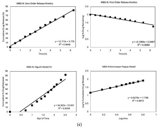 Figure 9c illustrates the model fit for MBG-N, where most models demonstrate a high R2. The high fit across the different models may be caused by the high initial release followed by the release of all the loaded antibiotics within the first few days of the study [54]. The zero-order model shows an excellent fit, suggesting that drug release is concentration-independent, which is unusual for porous systems and may indicate a complex release mechanism [55].