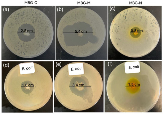 Figure 10 also tests antibacterial activity against Gram-negative E. coli. In Figure 10d, MBG-C shows a ZOI of 1.8 cm against E. coli. Figure 10e demonstrates MBG-M’s stronger effect, with a larger ZOI of 3.4 cm, proving it works equally well against both Gram-negative and Gram-positive bacteria. Finally, Figure 10f reveals MBG-N has a ZOI of 1.5 cm against E. coli, showing it is more effective against Gram-negative bacteria than Gram-positive ones.