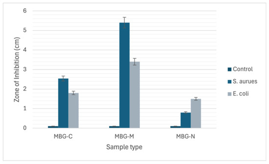 The chart graph depicts the zone of inhibition (ZOI) measurements for MBG-C, MBG-M, and MBG-N against both S. aureus and E. coli bacterial strains.