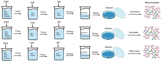 Schematic illustration of bioactive glass synthesis using salt templating. The diagram compares the synthesis processes employing Mg(OH)2 and NaCl as templates, highlighting the distinct template removal methods (calcination, acid washing, or water washing).