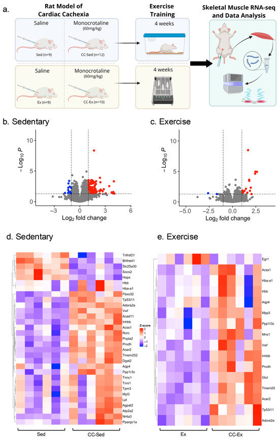 Summary of experimental design and representation of differentially expressed genes (DEG). (a) Animal model of cachexia, exercise intervention and skeletal muscle RNA-sequence analysis. Volcano Plots show DEGs based on their log fold change for the (b) sedentary (Sed vs. CC-Sed), and (c) exercise (Ex vs. CC-Ex); red dots are upregulated DEGs, blue dots are downregulated DEGs, and grey dots are non-significant DEGs. Heat maps represent some DEGs based on z-score for the (d) sedentary and (e) exercise comparisons. Sed: control sedentary; Ex: control exercised; CC-Sed: cardiac cachexia sedentary; CC-Ex: cardiac cachexia exercised.